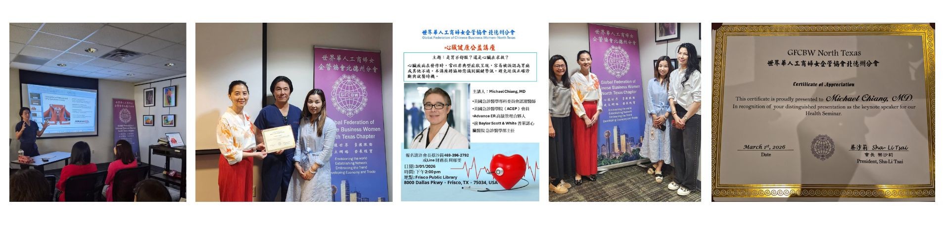 Dr. Chiang also shares his medical knowledge through community engagement. On March 1, he spoke at the Global Federation of Chinese Business Women of North Texas, connecting with local leaders and community members to discuss important health topics.